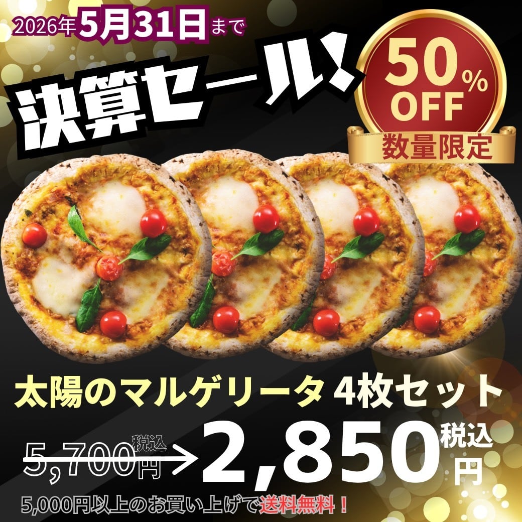 日頃のご愛顧に感謝して、2026年5月31日まで決算セール開催中!大人気の「太陽のマルゲリータ」4枚セットがなんと半額!!!