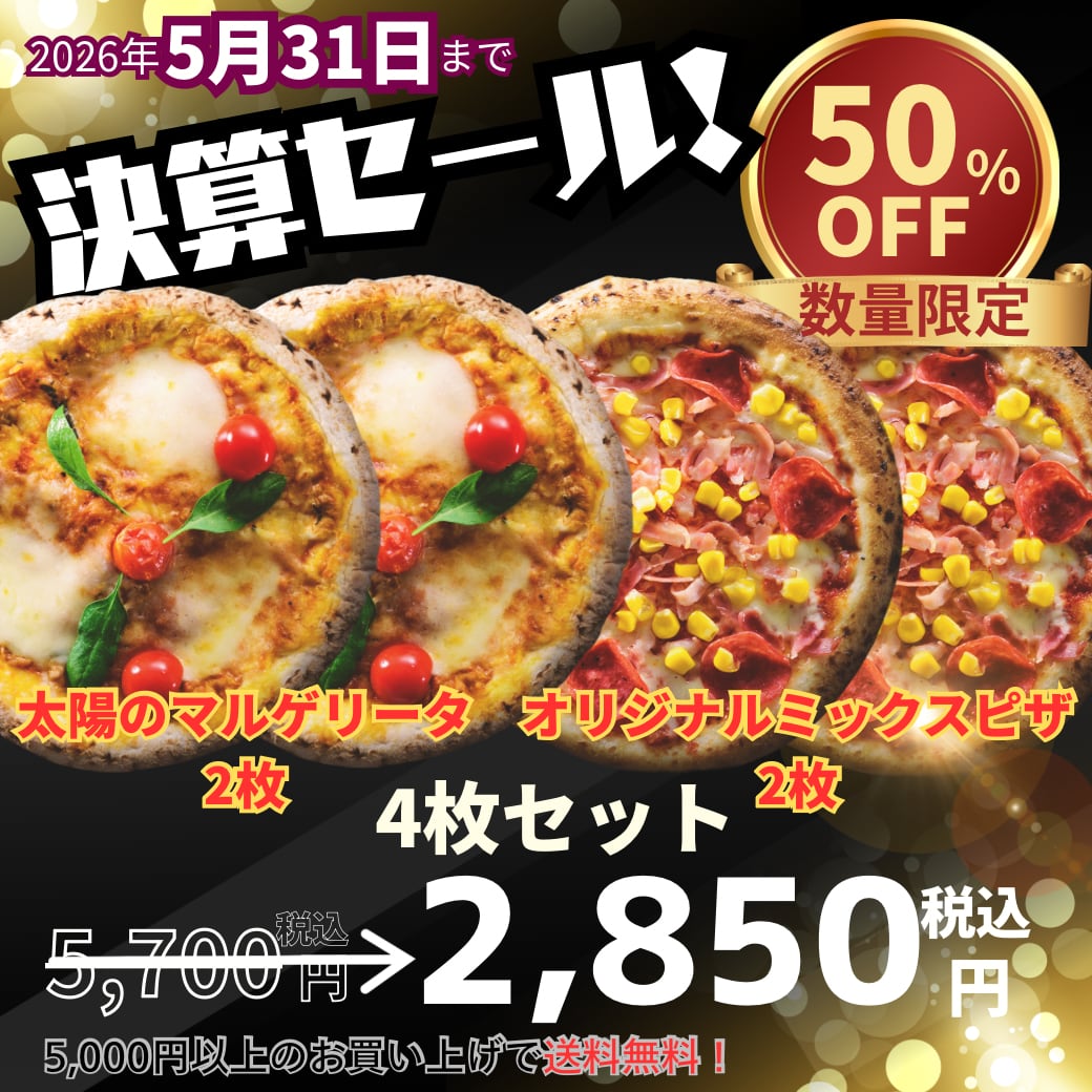 日頃のご愛顧に感謝して、2026年5月31日まで決算セール開催中!大人気の「太陽のマルゲリータ」2枚+「オリジナルミックスピザ」2枚の計4枚セットがなんと半額!!!